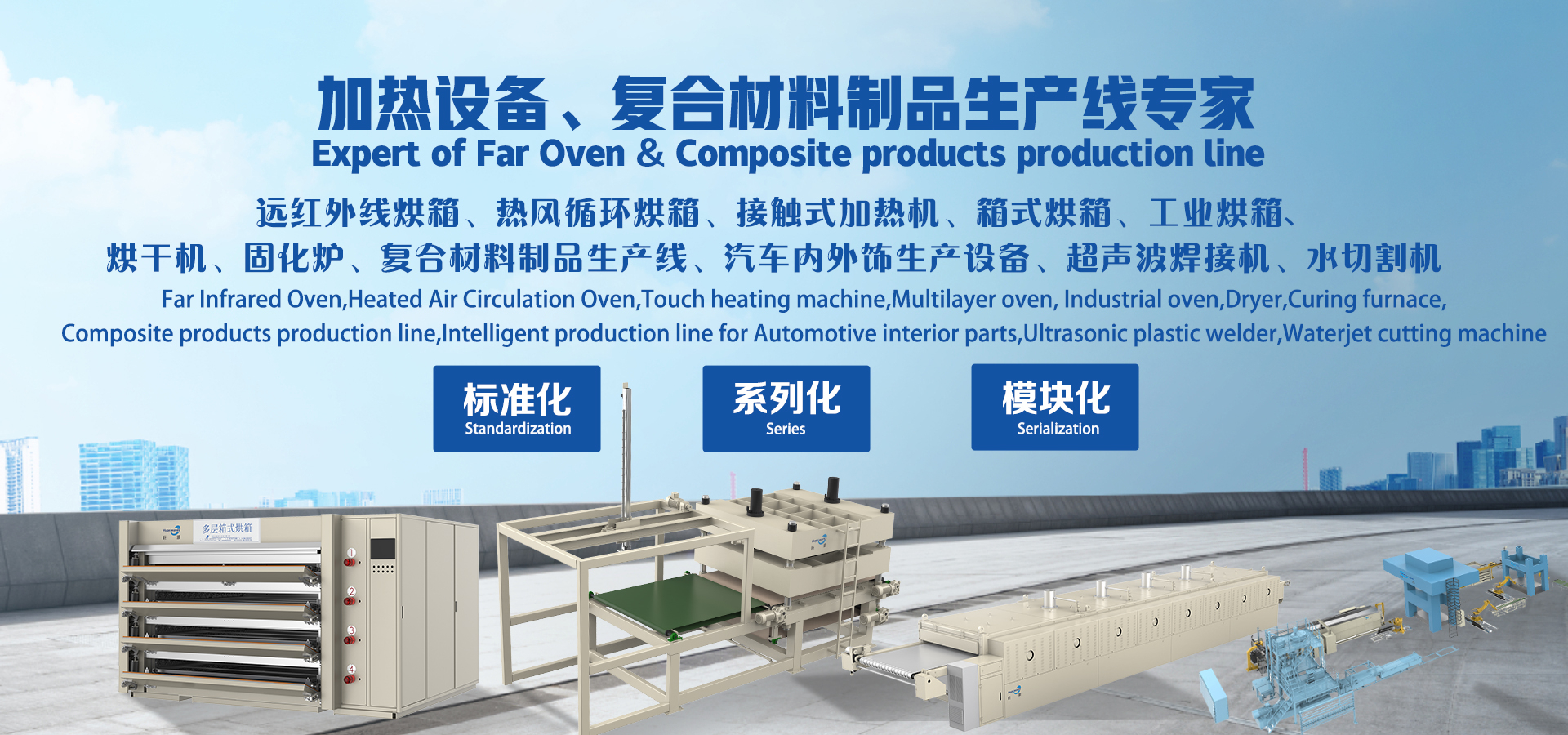 The following fields are covered: Far Infrared Oven, Heated Air Circulation Oven,Industrial oven,Curing furnace,Multilayer oven, Touch type heater,Multi-layer touch type heater,PET composite products intelligent production line,LWRT (lightweight reinforced thermoplastics) intelligent production line, GMT (glass mat reinforced thermoplastics) intelligent production line,LFT (long fiber reinforced thermoplastics) intelligent production line, Intelligent heating production line for Automobile carpet, Intelligent heating production line for Automobile ceiling, Intelligent heating production line for automobile wheel cover, Intelligent heating production line for Automotive interior parts,New energy vehicle battery cover and lower shell intelligent production line, SMC composite products intelligent production line,HP-RTM /HP-CRTM composite products intelligent production line,Intelligent heating production line for composite products, Ultrasonic plastic welding machine, Hot plate welding machine,Teflon strip composite machine, Steel strip composite machine, Felt sheet composite machine, Heating equipment supporting automation equipment, Such as truss loading manipulator and frame loading manipulator, Automatic up and down feeding machine, Spreading Machine, Automatic loading and unloading by robot, Gripper, Acupuncture group, Lorry, Air motor return device, Elevation structure etc.